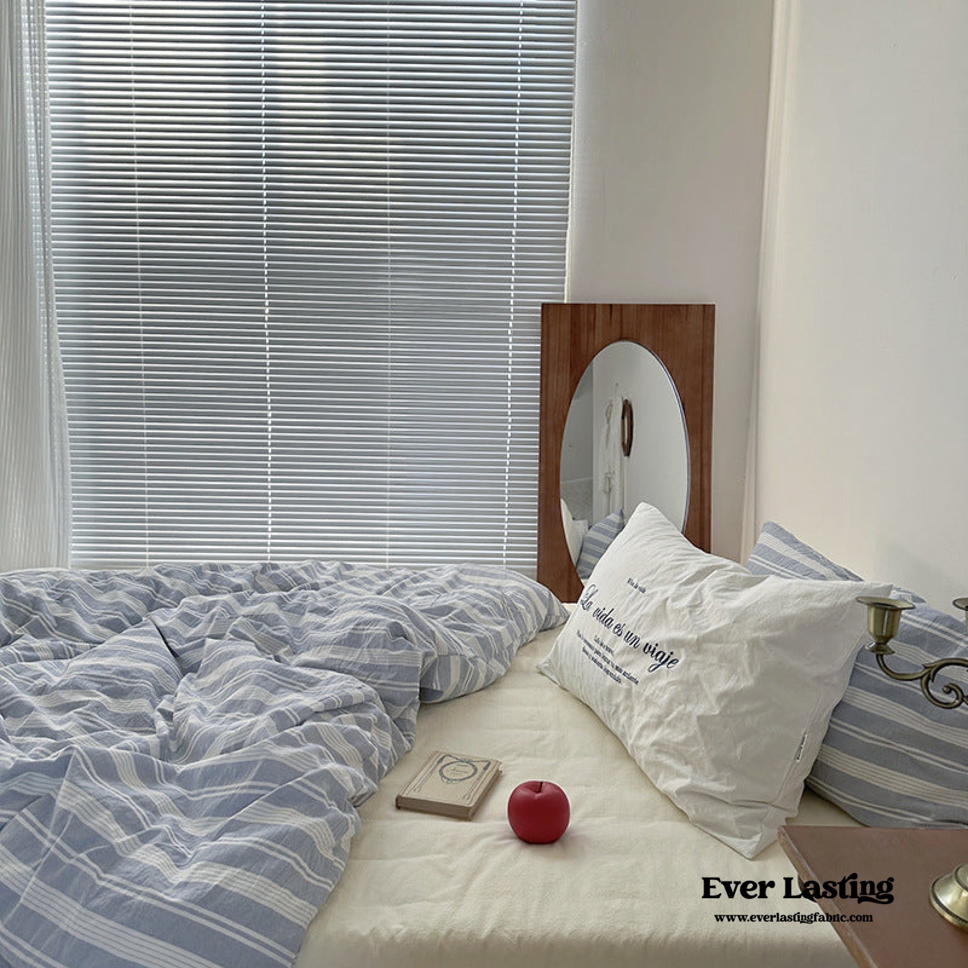 Elevate your bedroom with our effortlessly chic Blue Striped Washed Cotton Bedding Set. Made from premium washed cotton, it brings a relaxed, laid-back vibe to your space. The classic striped pattern adds a touch of timeless charm to your décor while the soft, breathable fabric promises a cozy night's sleep. With convenient features like four corner ties and a hidden zipper on each duvet cover, refreshing your bed is a breeze.