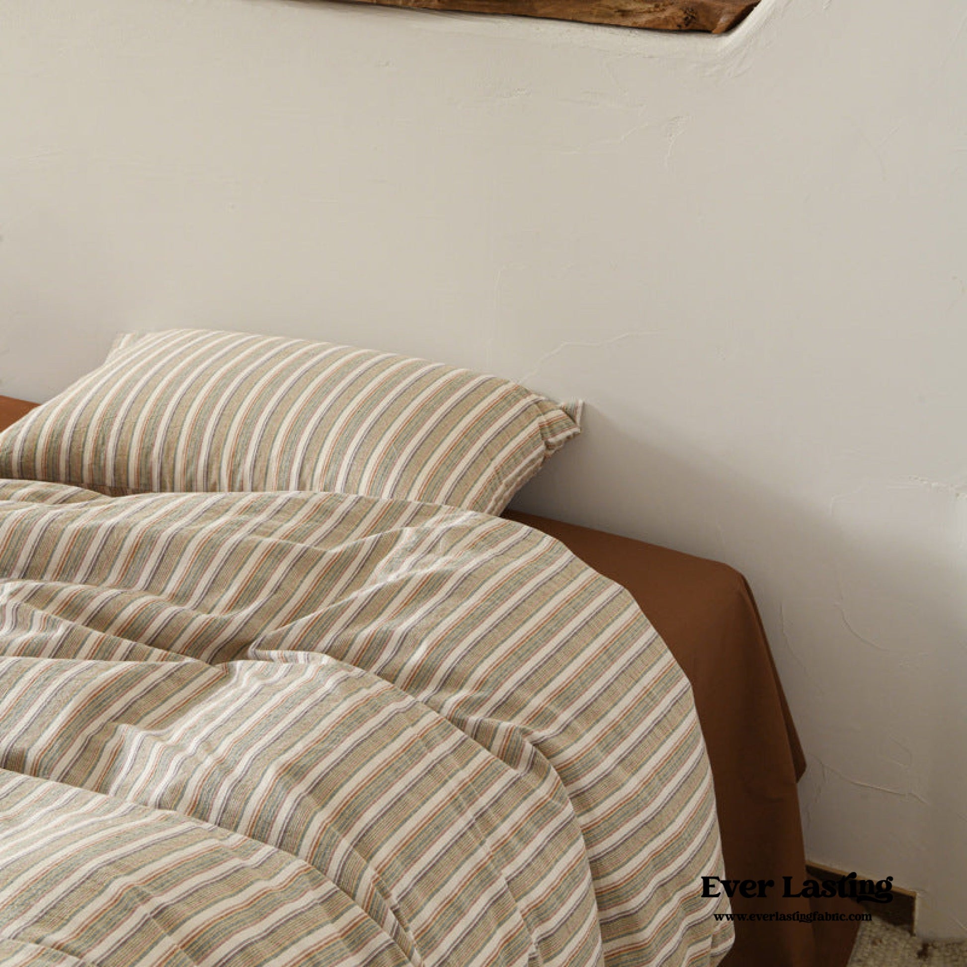 Transform your bedroom into a serene retreat with Ever Lasting's Clara Vintage Minimalist Striped Bedding Set. Made from breathable, 100% washed cotton, this set combines unparalleled softness with durability for a restful night's sleep. The subtle striped pattern and neutral tones add sophisticated versatility to any décor.Designed with practicality in mind, the duvet cover includes corner ties and a concealed zipper for secure placement, while pillowcases feature envelope closures for a polished finish. Elevate your space with this perfect blend of comfort and timeless simplicity.