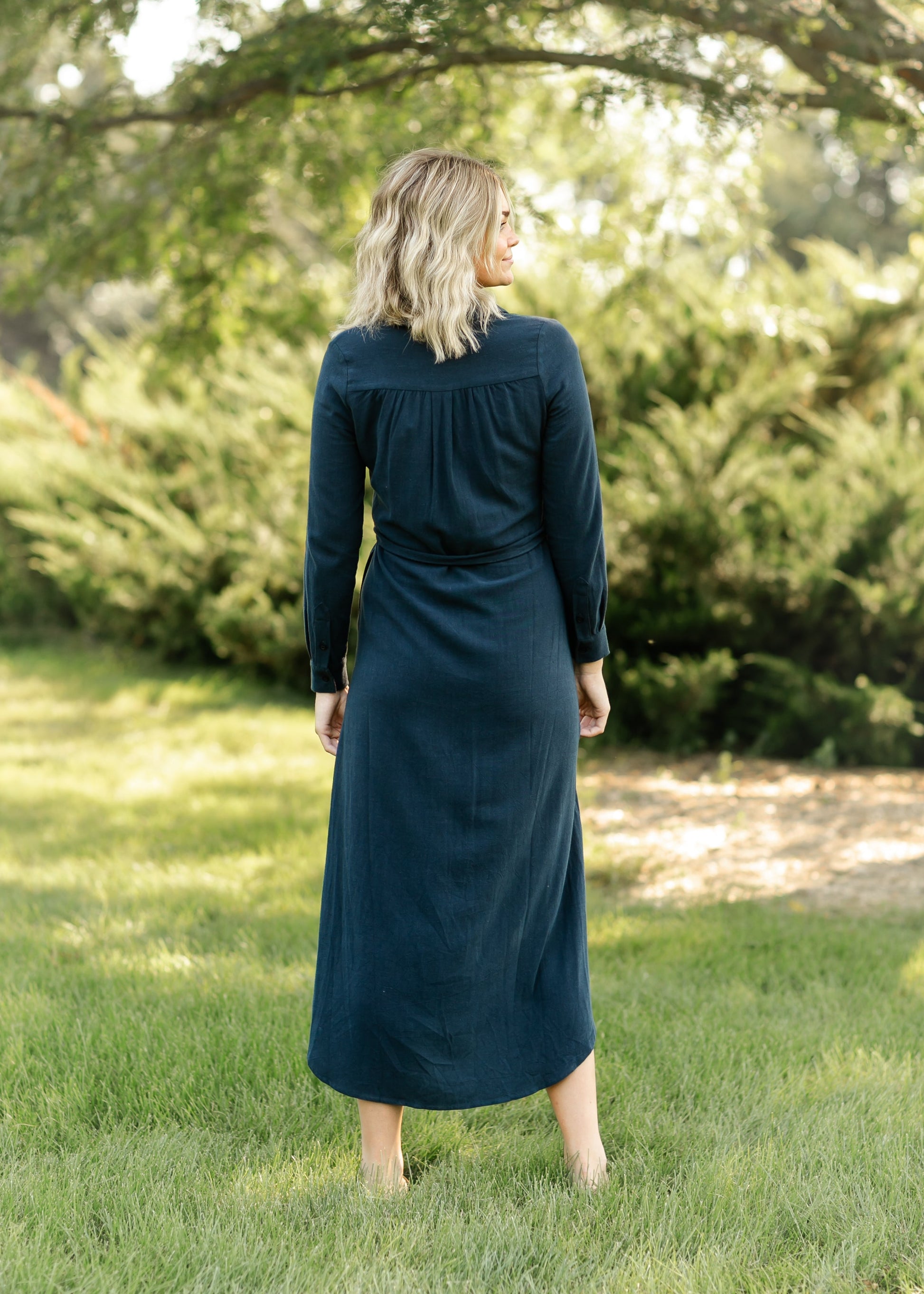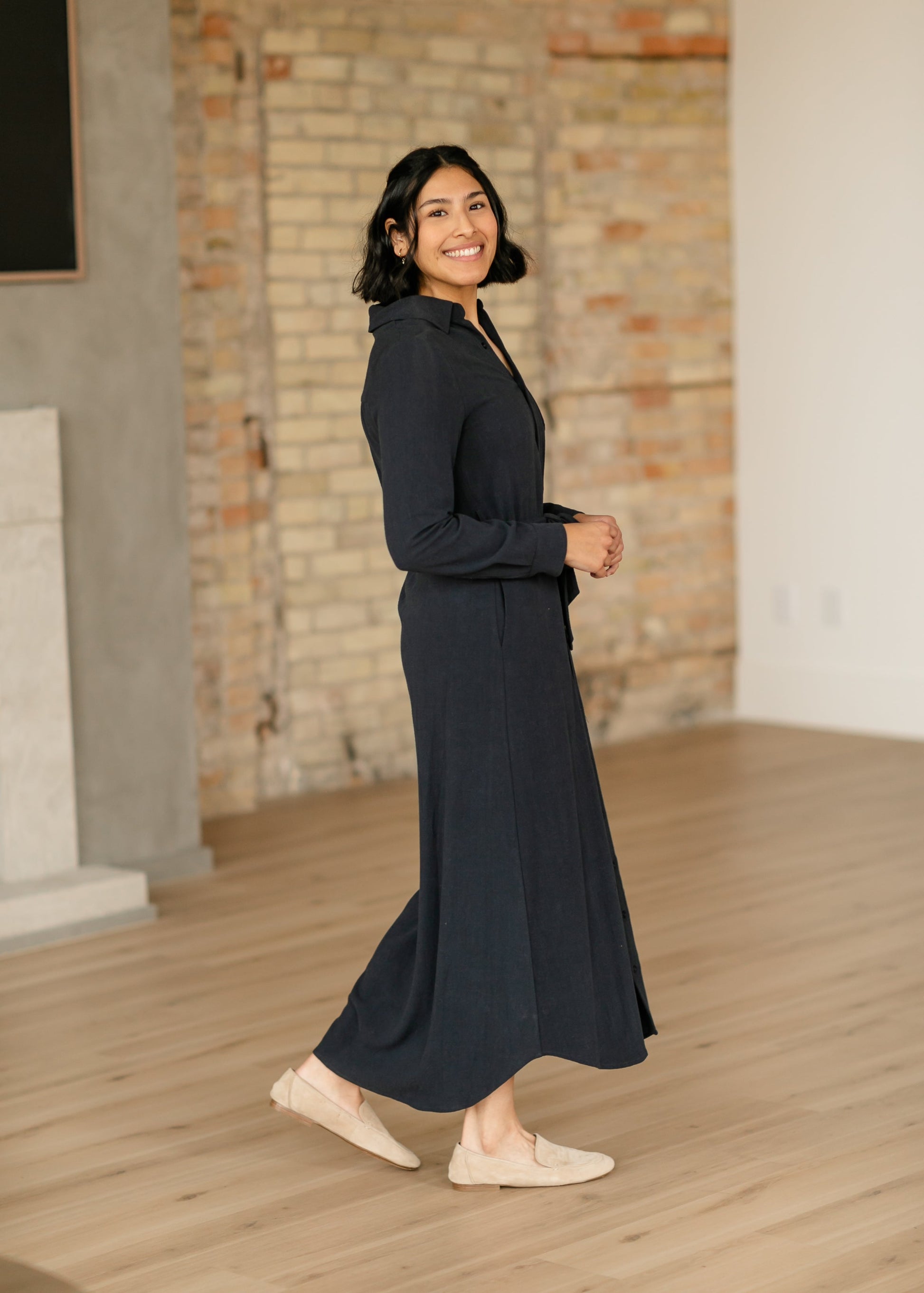 The Essential Long Sleeve Linen Shirt Dress is a breathable, nursing-friendly favorite made from a lightweight linen blend. With a full button front, removable self-tie belt, and button-cuffed sleeves, this modest silhouette offers versatility and comfort. Dress it up or down for any season, it's a timeless piece you'll reach for on repeat.