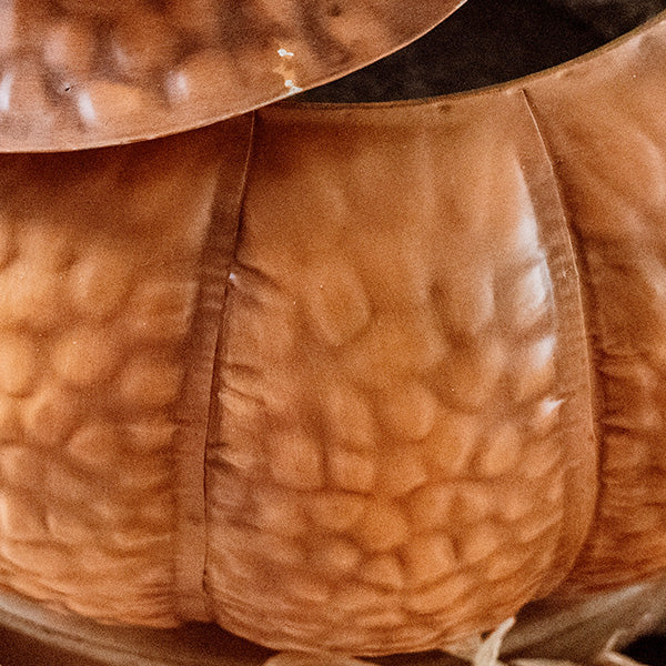 Embrace the spooky spirit of Halloween without the mess with our Indoor/Outdoor Metal Pumpkin with Lid! No need for carving or scooping slimy seeds—this beautifully crafted metal pumpkin brings all the festive charm, minus the fuss. Designed to last season after season, it’s the perfect addition to your haunted setup, giving your space a timeless farmhouse appeal.