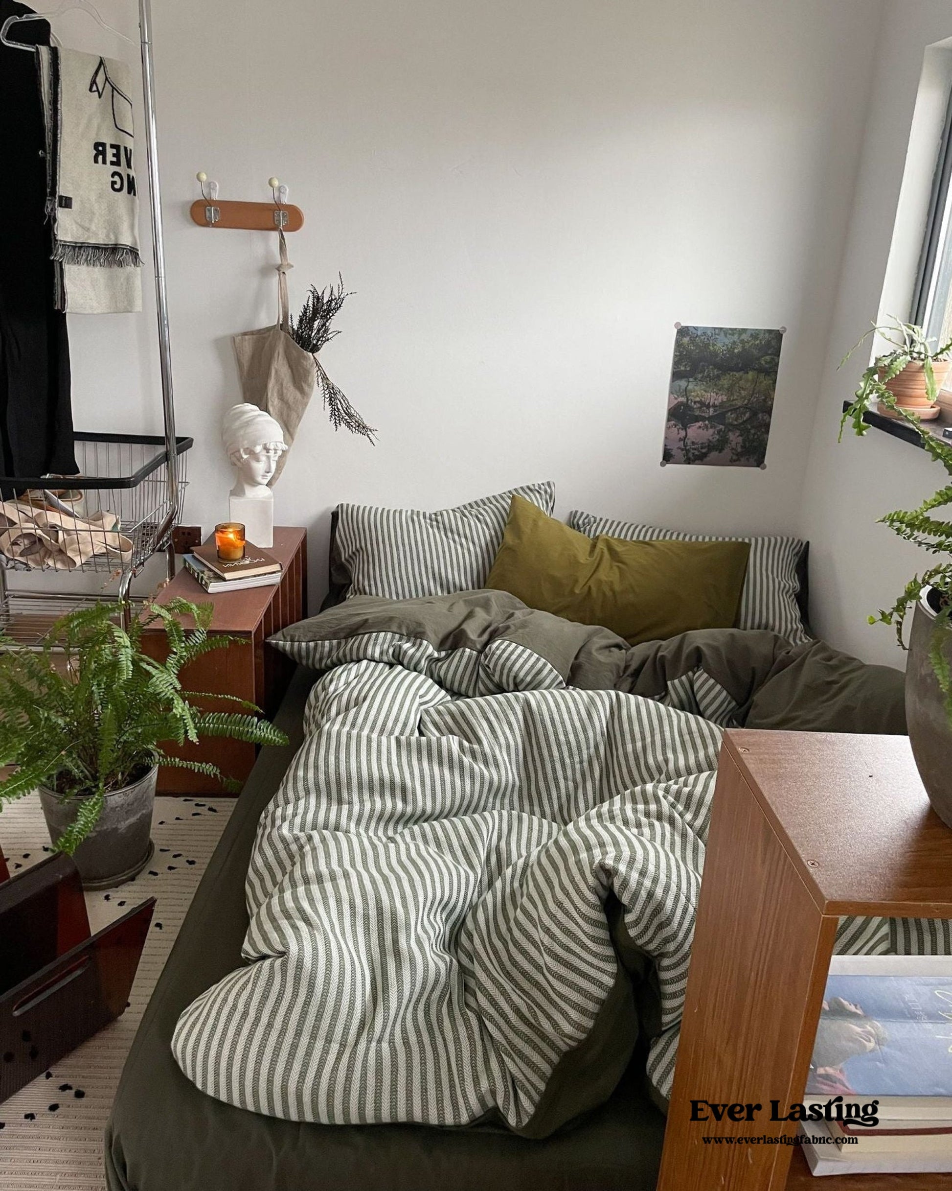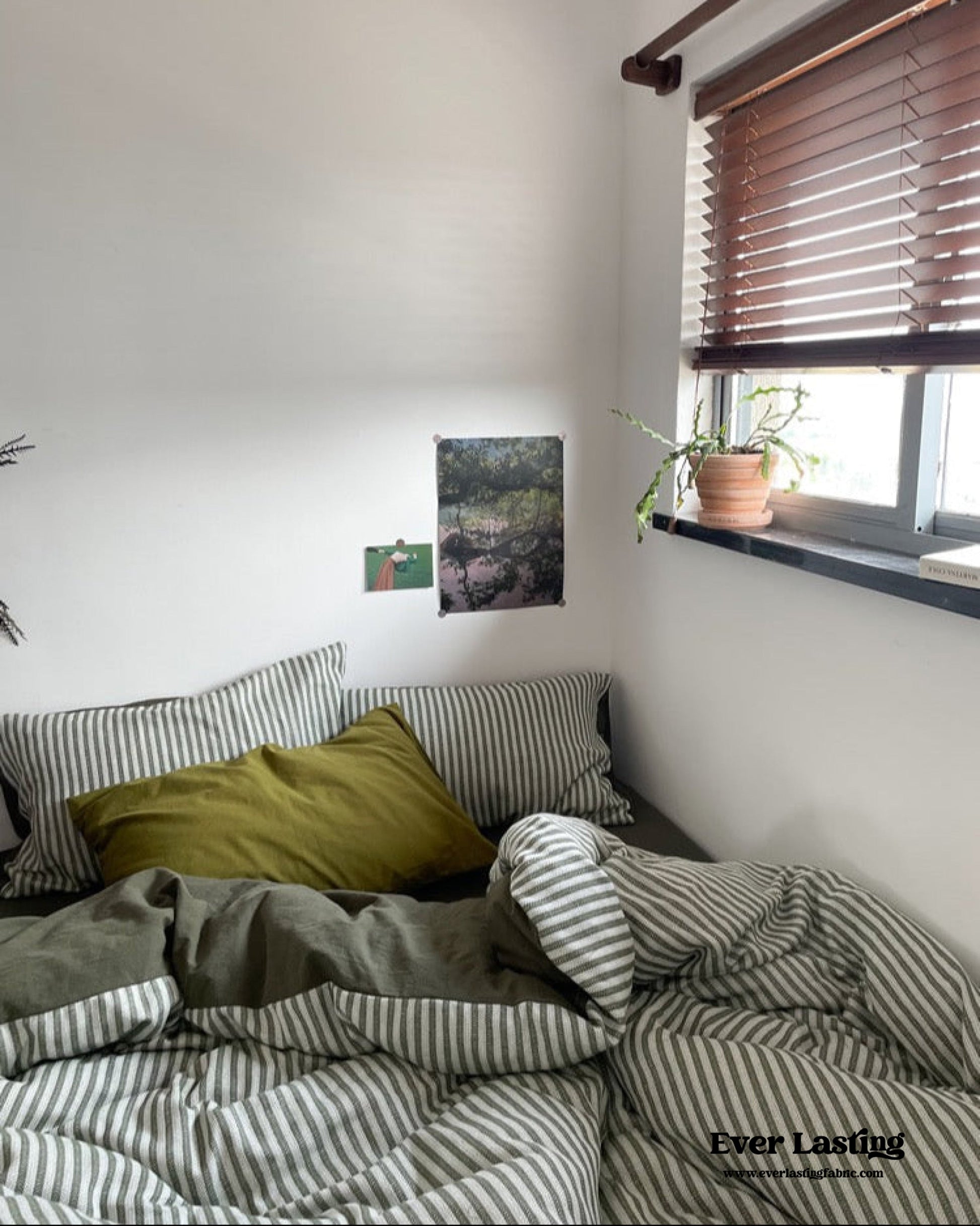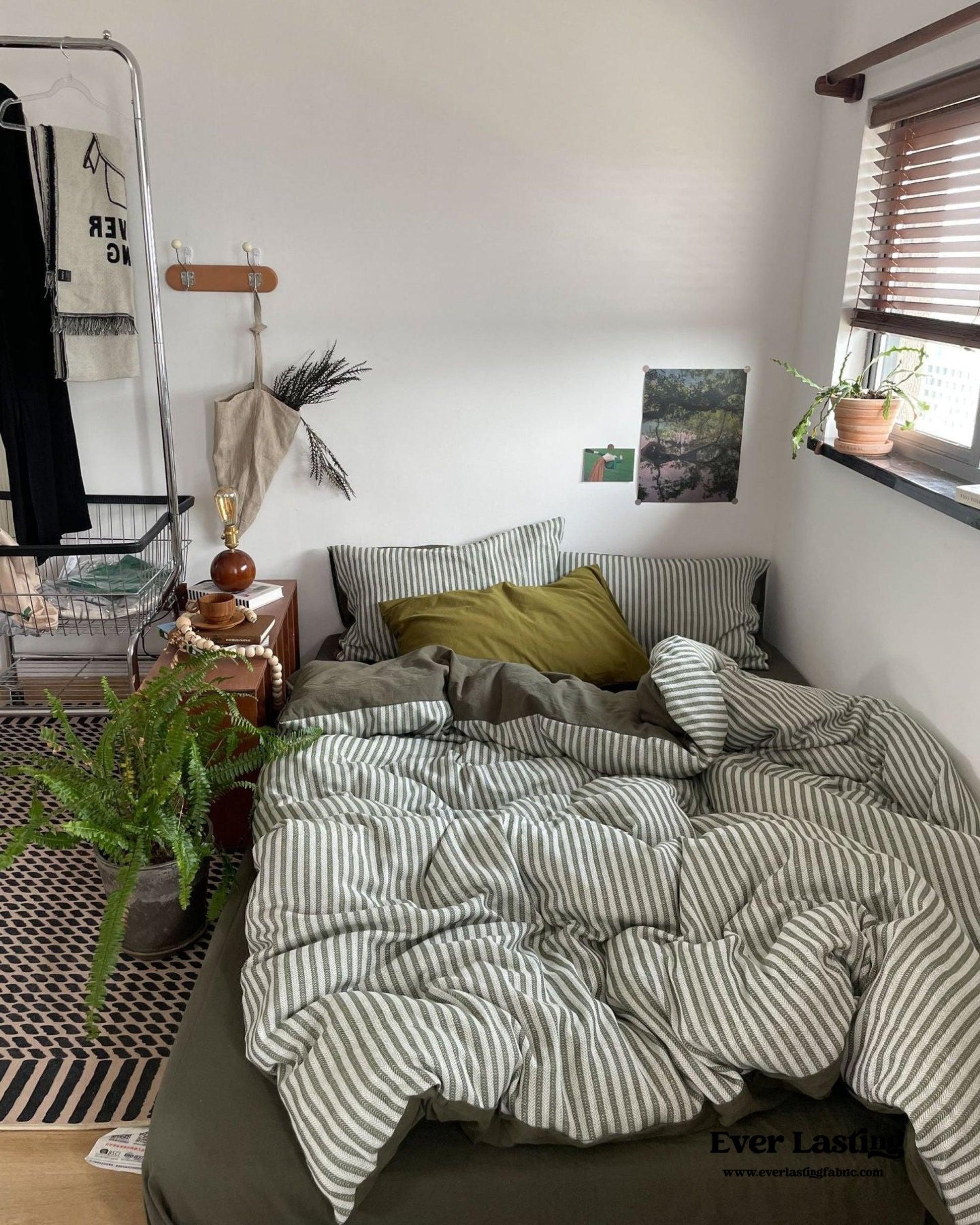 Elevate your bedroom with Ever Lasting’s Moss Green Striped Jacquard Bedding Set, a perfect blend of timeless elegance and modern comfort. Designed for those who adore coquette and vintage-inspired aesthetics, this bedding set features a sophisticated jacquard weave with delicate gray-green stripes, adding a touch of refined charm to your space. Crafted from 100% washed cotton, this set offers exceptional softness, breathability, and durability—ensuring a cozy and restful night's sleep. Each duvet cover features corner ties and zippers for securing duvet inserts, promising enduring quality tailored just for you. The matching pillowcases and fitted sheet complete the ensemble, bringing effortless sophistication and comfort to your bedding collection.