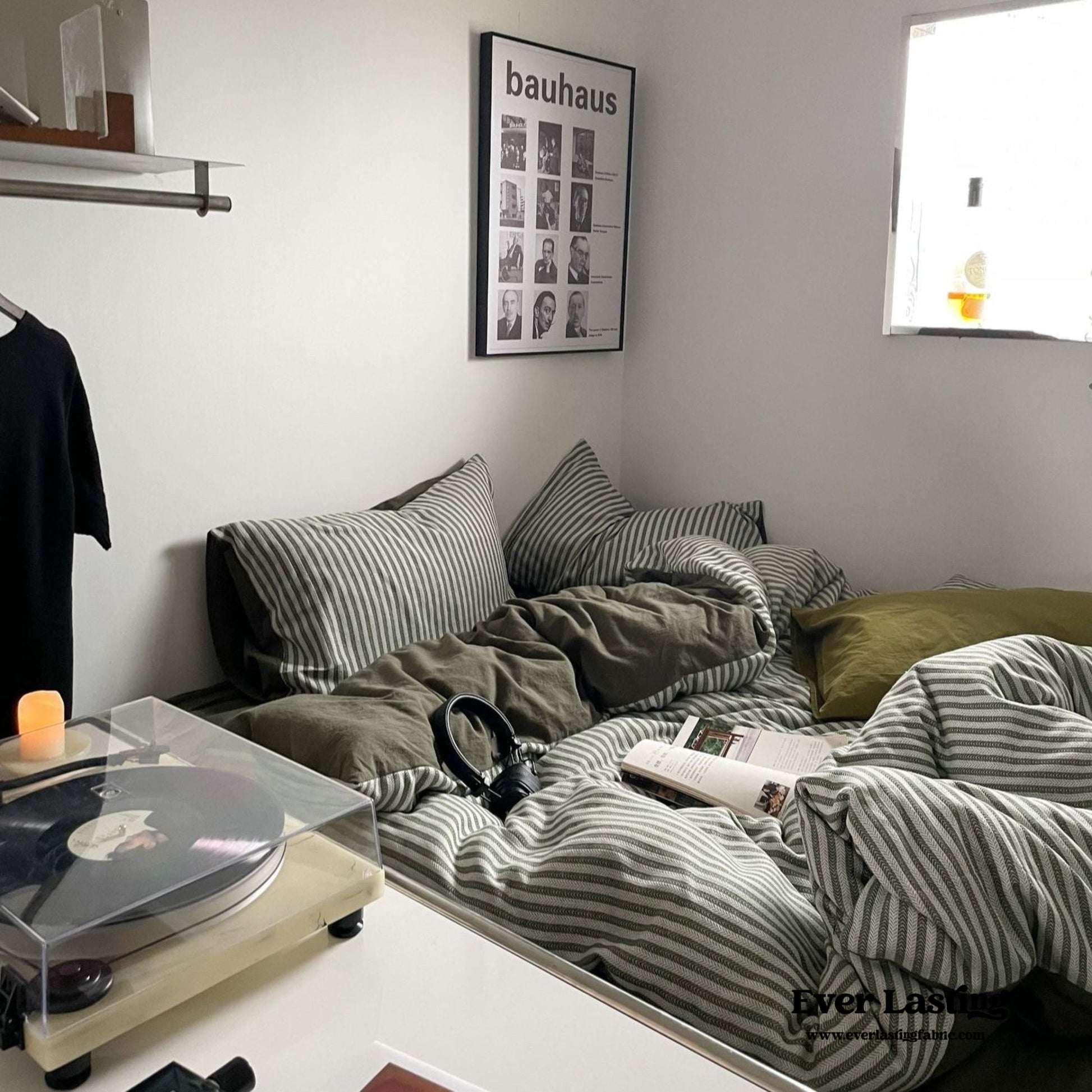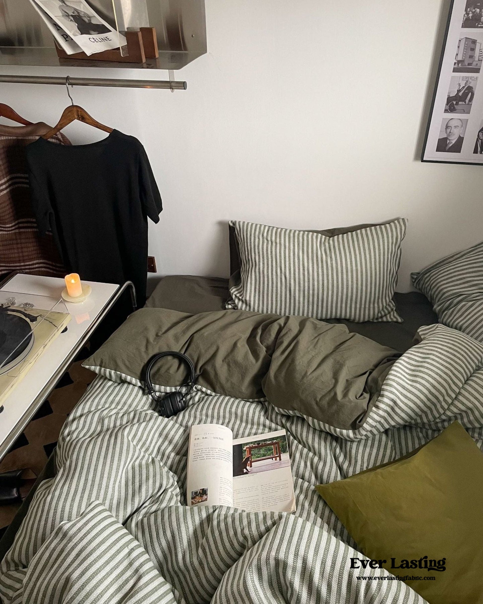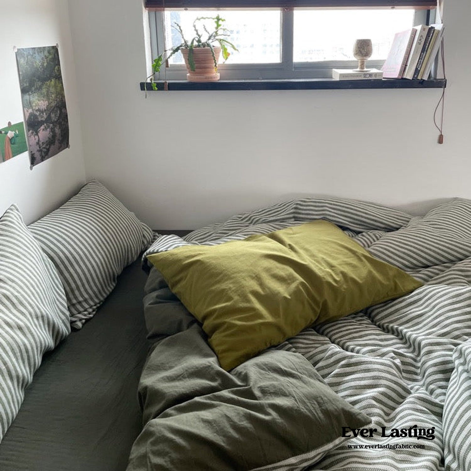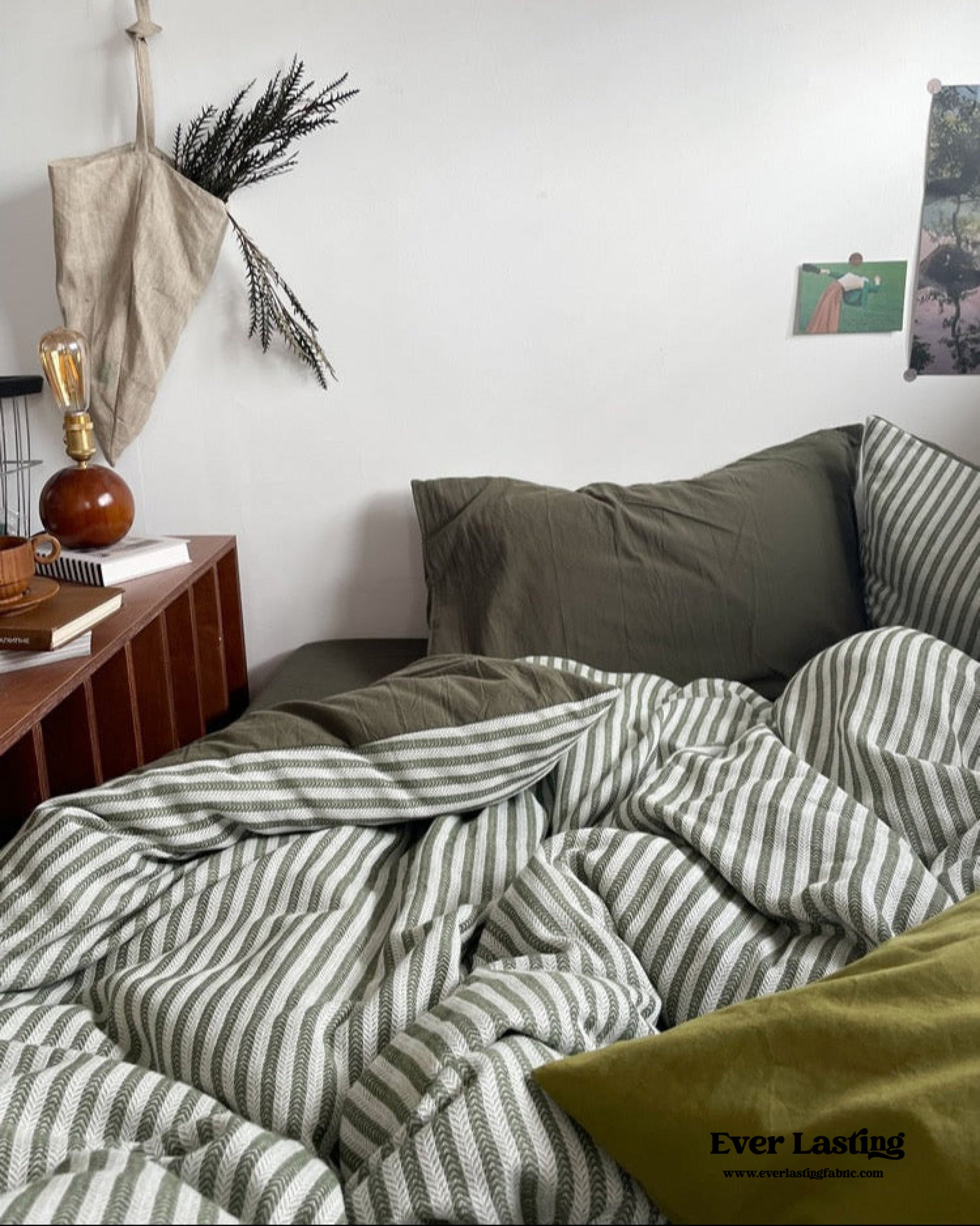 Elevate your bedroom with Ever Lasting’s Moss Green Striped Jacquard Bedding Set, a perfect blend of timeless elegance and modern comfort. Designed for those who adore coquette and vintage-inspired aesthetics, this bedding set features a sophisticated jacquard weave with delicate gray-green stripes, adding a touch of refined charm to your space. Crafted from 100% washed cotton, this set offers exceptional softness, breathability, and durability—ensuring a cozy and restful night's sleep. Each duvet cover features corner ties and zippers for securing duvet inserts, promising enduring quality tailored just for you. The matching pillowcases and fitted sheet complete the ensemble, bringing effortless sophistication and comfort to your bedding collection.