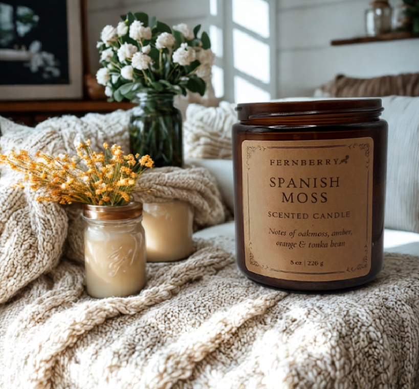 Hand-poured just outside Asheville, NC, this 8 oz candle features a low-smoke crackling wood wick and burns for 45–55 hours. Made with premium essential and fragrance oil blends that are always phthalate-free, Fernberry candles deliver a refined, layered scent experience.
